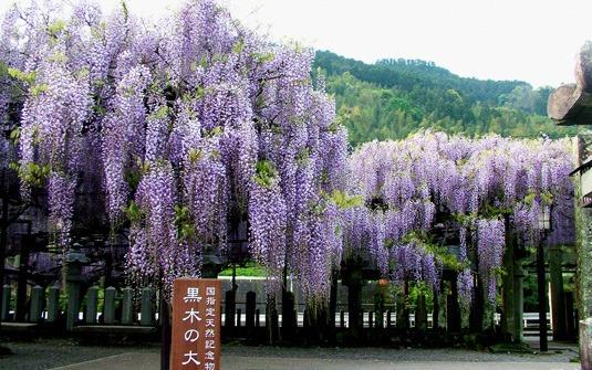 大藤のある素戔嗚(すさのお)神社には、約3,000平方メートルもの広大な藤棚が広がっており、毎年4月中旬ごろに開花し、1メートルを超える紫色の花房を垂下させます。