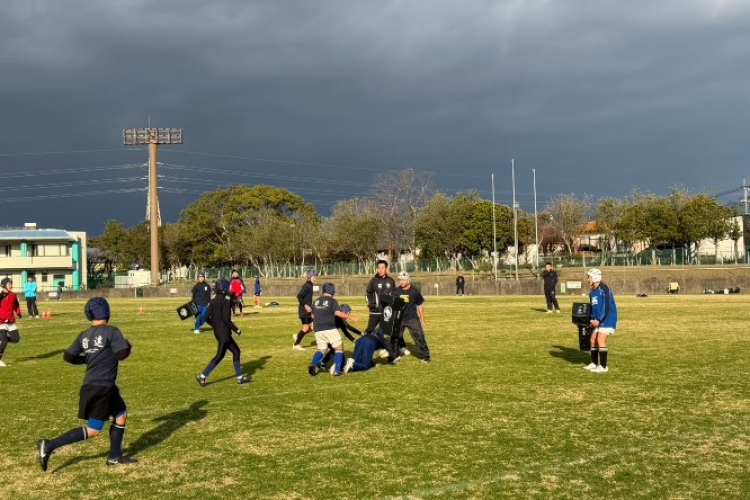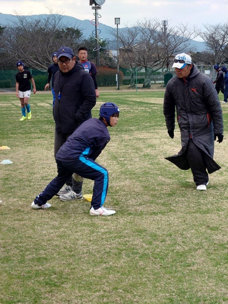 • タックル練習: 中学生が持つコンタクトバッグに向かって、低く、強く当たる姿勢を繰り返し確認。