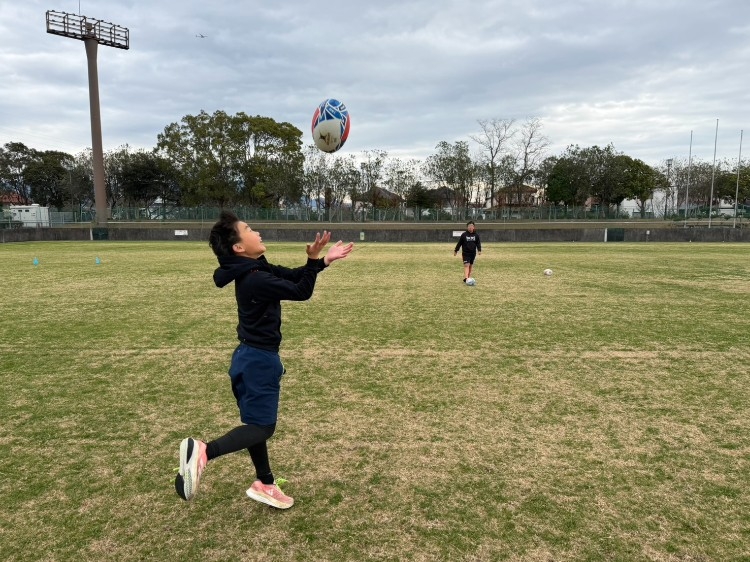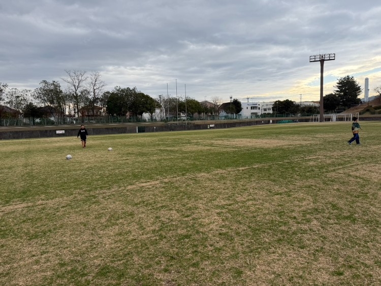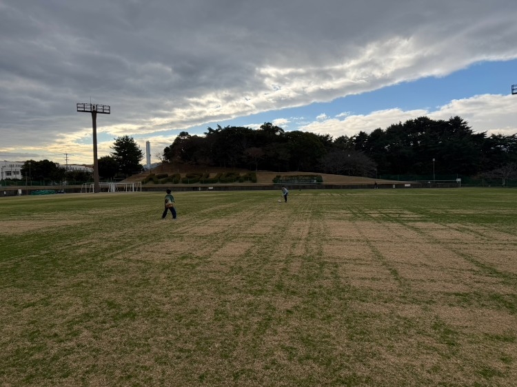 • 広々とした芝生の上でのキャッチング練習