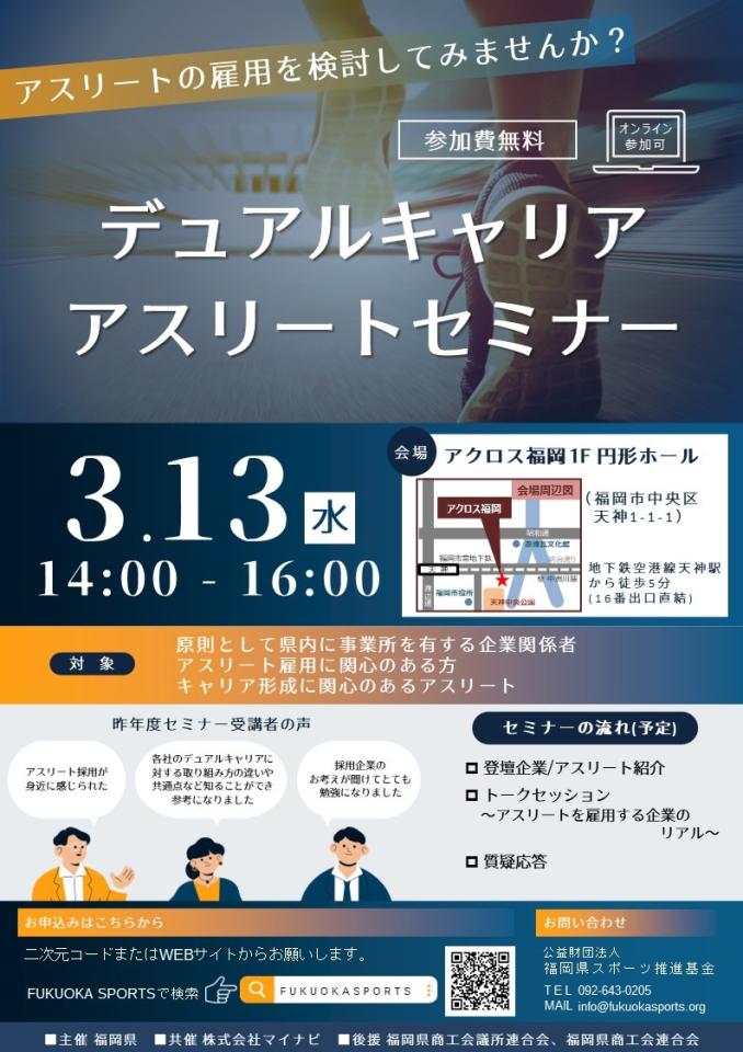 福岡県では、アスリートが安心して競技を続けられる環境の構築を目指し、競技活動と就業を両立する“デュアルキャリア”を広く普及するため「アスリートキャリアサポート事業」を実施しています。