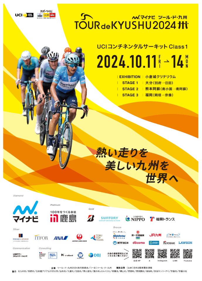 2024年10月、大分、熊本、福岡の3県を舞台にUCI(国際自転車競技連)公認の国際サイクルロードレース「マイナビ ツール・ド・九州2024」が開催されます。この大会は、サイクルツーリズムの推進に寄与するとともに、近年九州を襲った自然災害からの復興を象徴するイベントです。大会を通して、国内外のプロ選手たちによる“熱い走り”と“美しい九州”を世界に発信します。