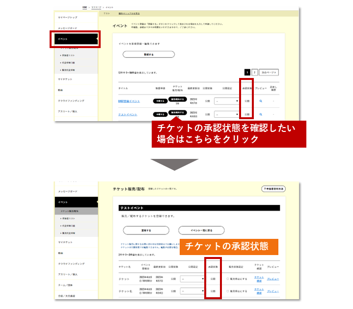 イベント・チケットの承認状態はマイページで確認できます